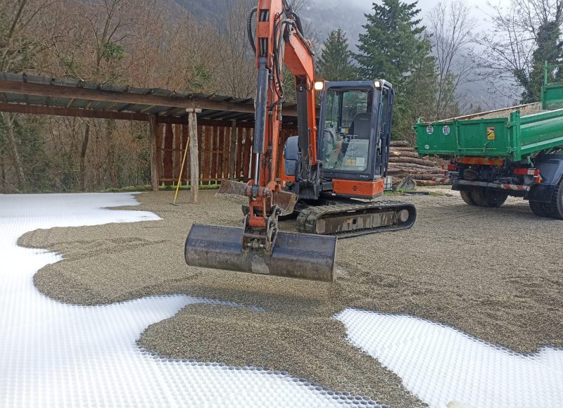 2- Réalisation d’un fond de forme en mélange terre / pierre (concassé 40/80) sur 25cm d’épaisseur. Cette étape est particulièrement importante et il ne faut pas négliger l’épaisseur de la couche de fondation pour la stabilité du revêtement. La présence de terre est quant à elle impérative pour assurer la pousse du gazon