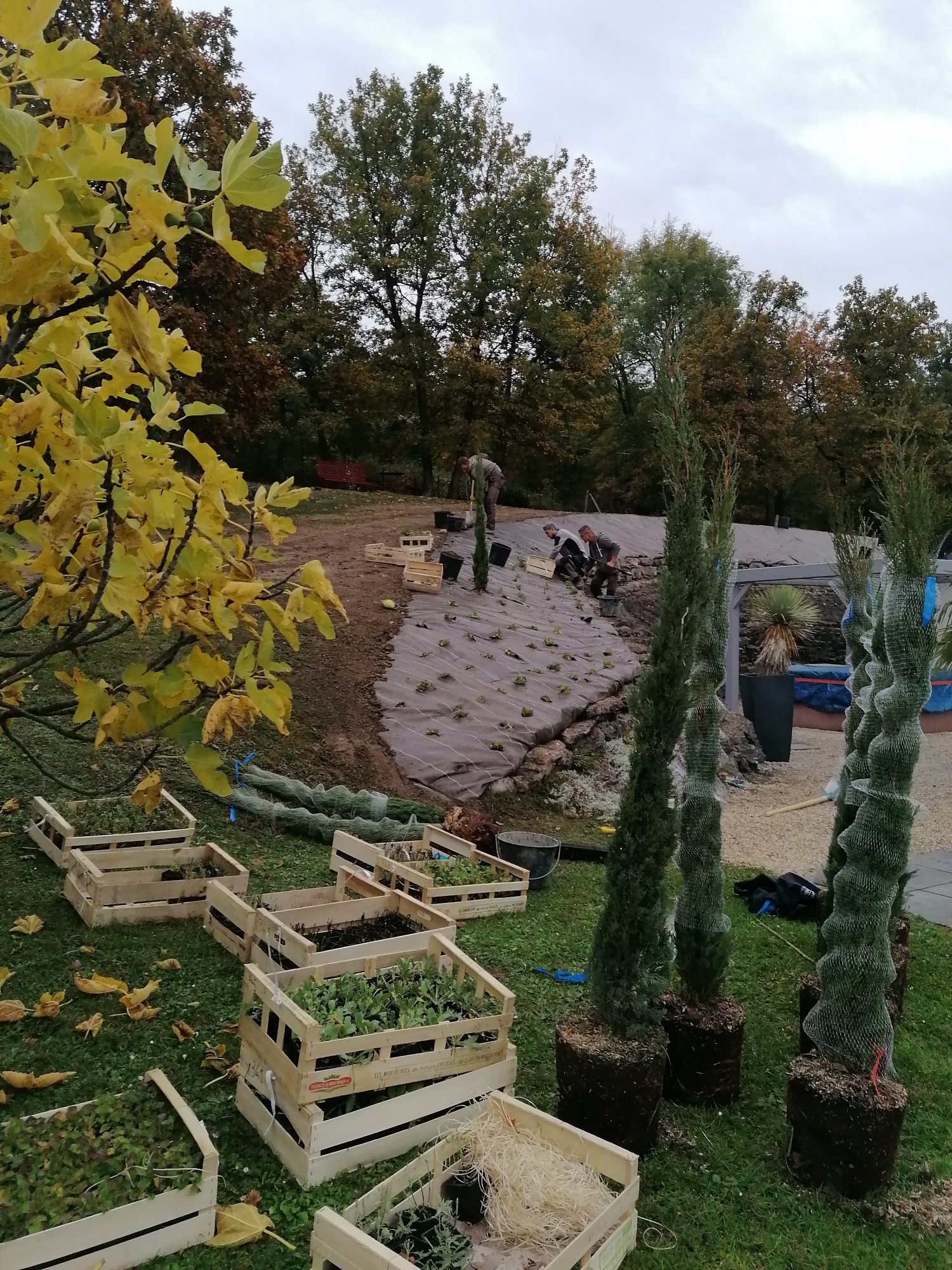 L’arc à végétaliser était très caillouteux, nous avons dû dans un premier temps évacuer plusieurs dizaines de centimètres de cailloux avant d’apporter de la terre végétale sur 40cm d’épaisseur. Étape indispensable pour permettre aux futures plantations de s’épanouir dans de bonnes conditions.