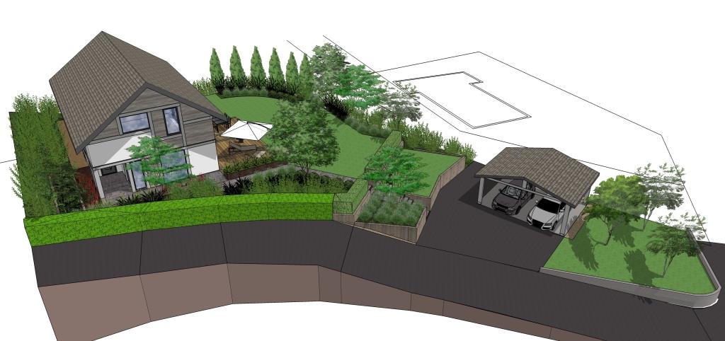 Pour aider notre client à imaginer son jardin, nous avons réalisé un plan de masse 2D pour lui permettre de visualiser l’emplacement des différents éléments végétaux (gazon, plantes, fleurs, arbustes, etc.) et aménagements paysagers (terrasse, dallage, clôture, etc.).