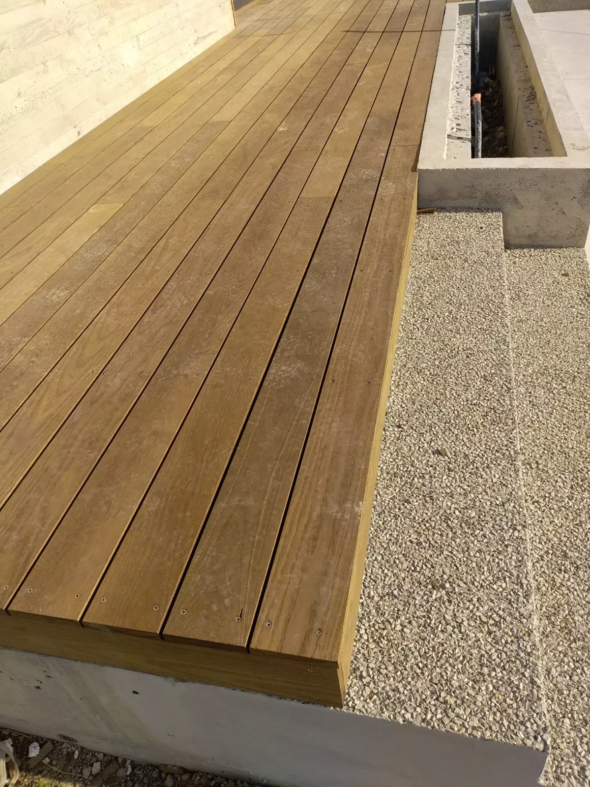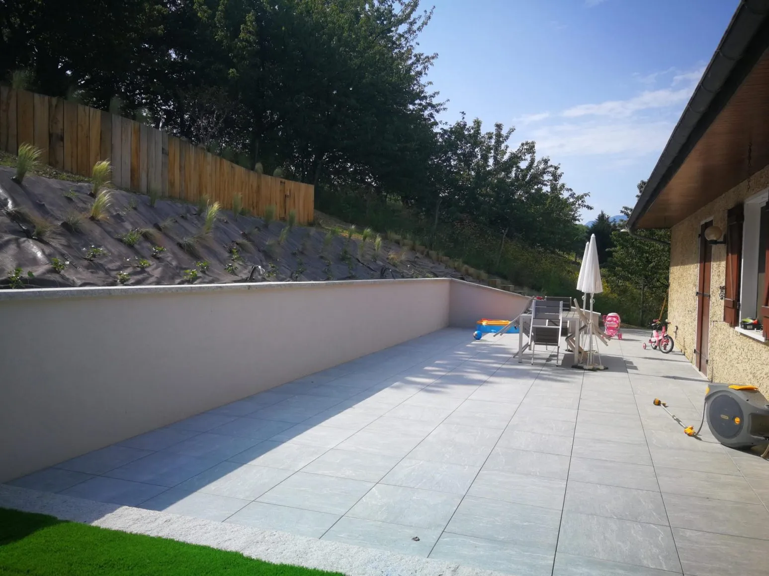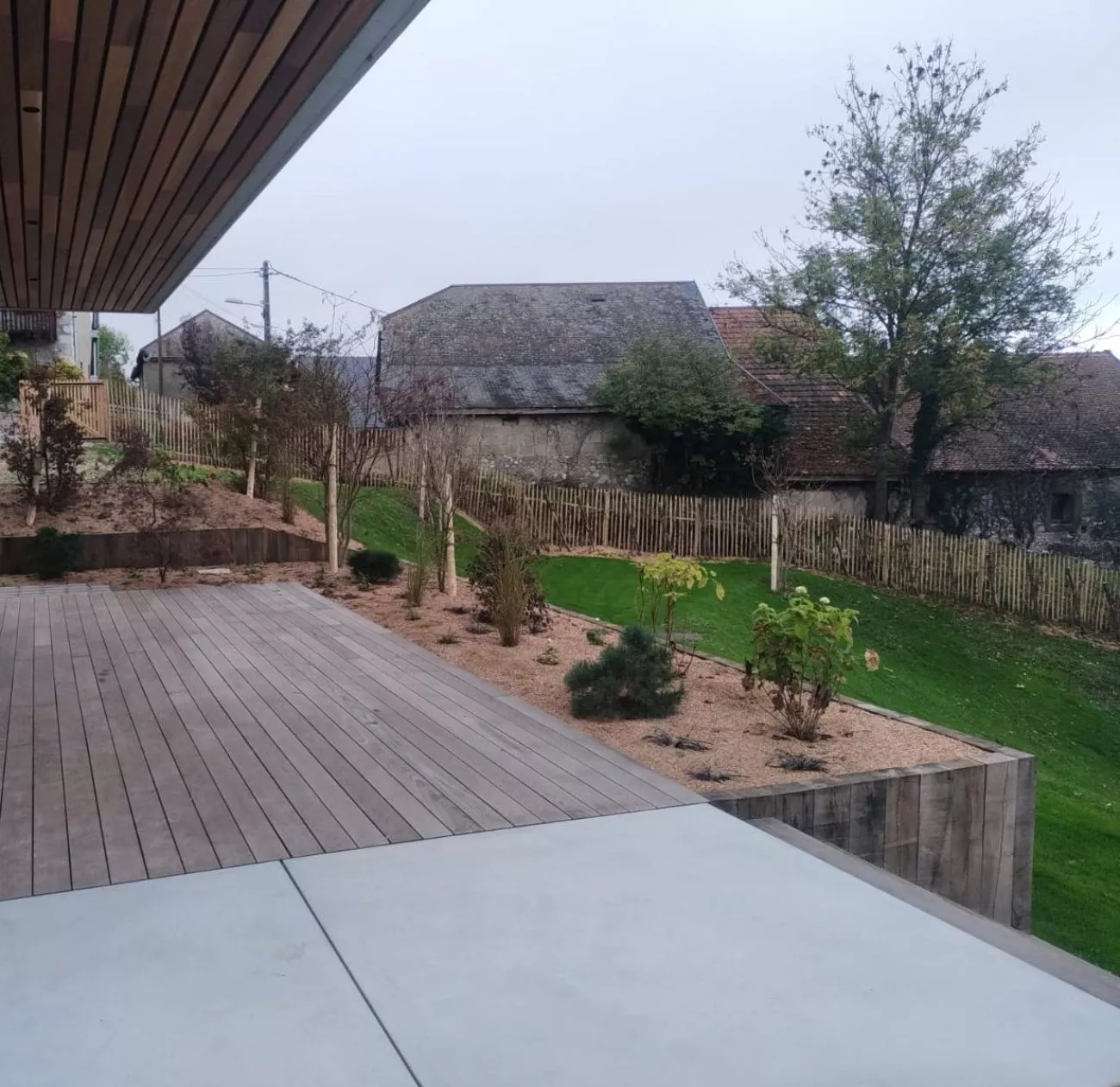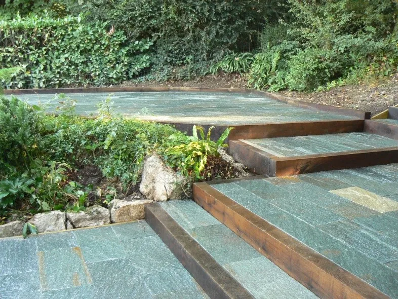 Chez Rat-Patron Jardins, nous privilégions les terrasses en bois, notamment en Frêne thermo-traité, un matériau à la fois résistant et esthétique. Nous apprécions également les terrasses en pierre naturelle, idéales pour apporter une touche intemporelle et élégante à votre espace extérieur.