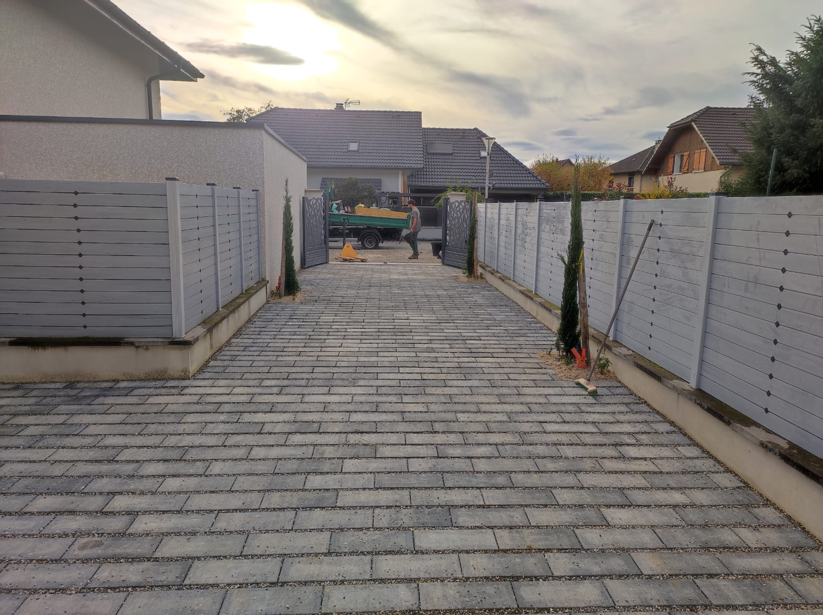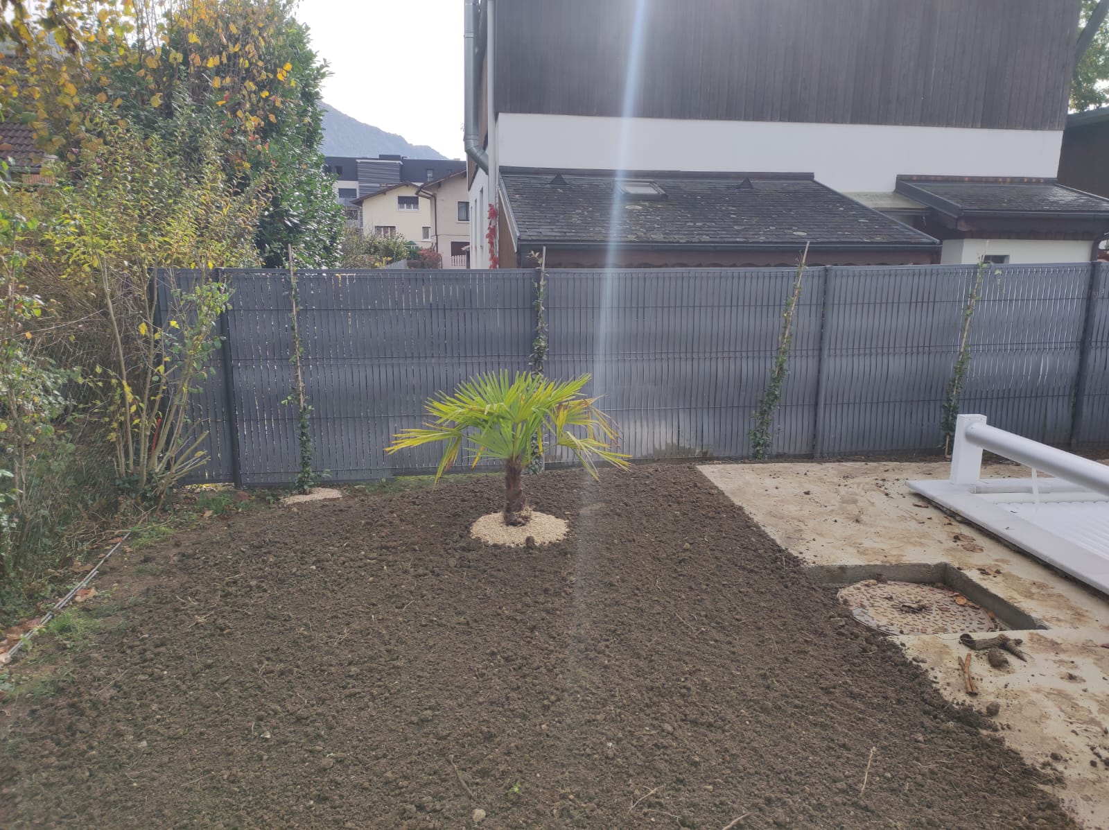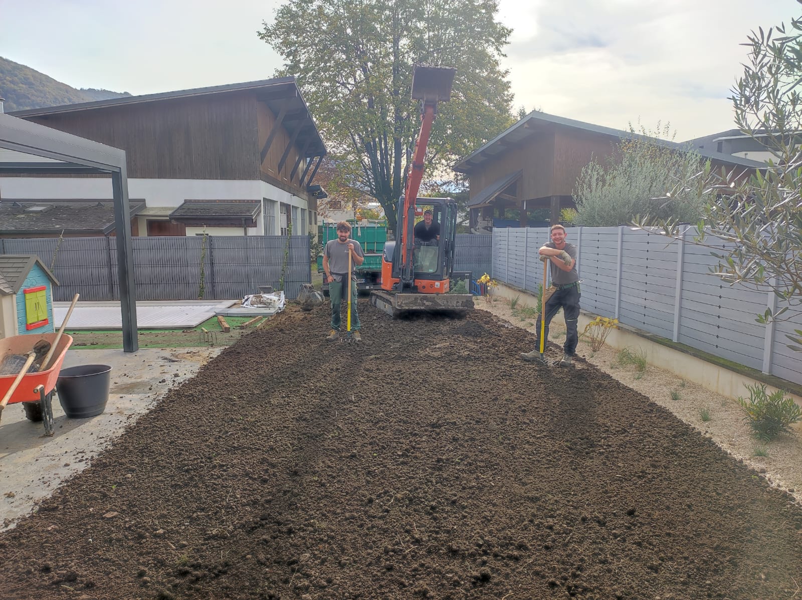 C’est à Bissy, proche de Chambéry, que notre entreprise de paysage a clôturé l’année 2025 avec un chantier paysager complet, mené dans une ambiance automnale… et sous une météo quelque peu normande !